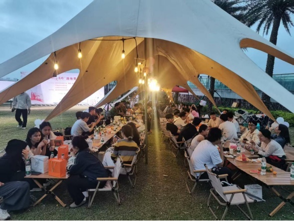 夜幕降临,天幕串灯亮起暖光,晚宴瞬间热闹起来!嘉宾轮番登台献唱涨盈配,民谣的温柔与流行曲的热烈交替碰撞;专业打碟师傅奏响轻快节拍,打破了交友的沉寂,让现场每个人都跟着节奏放松下来。随后,篝火燃起,活动迎来高潮——嘉宾们手牵手围绕着篝火,跟着动感旋律轻舞欢跳,现场的每一张笑脸都映着青春的羞涩与相遇的美好。