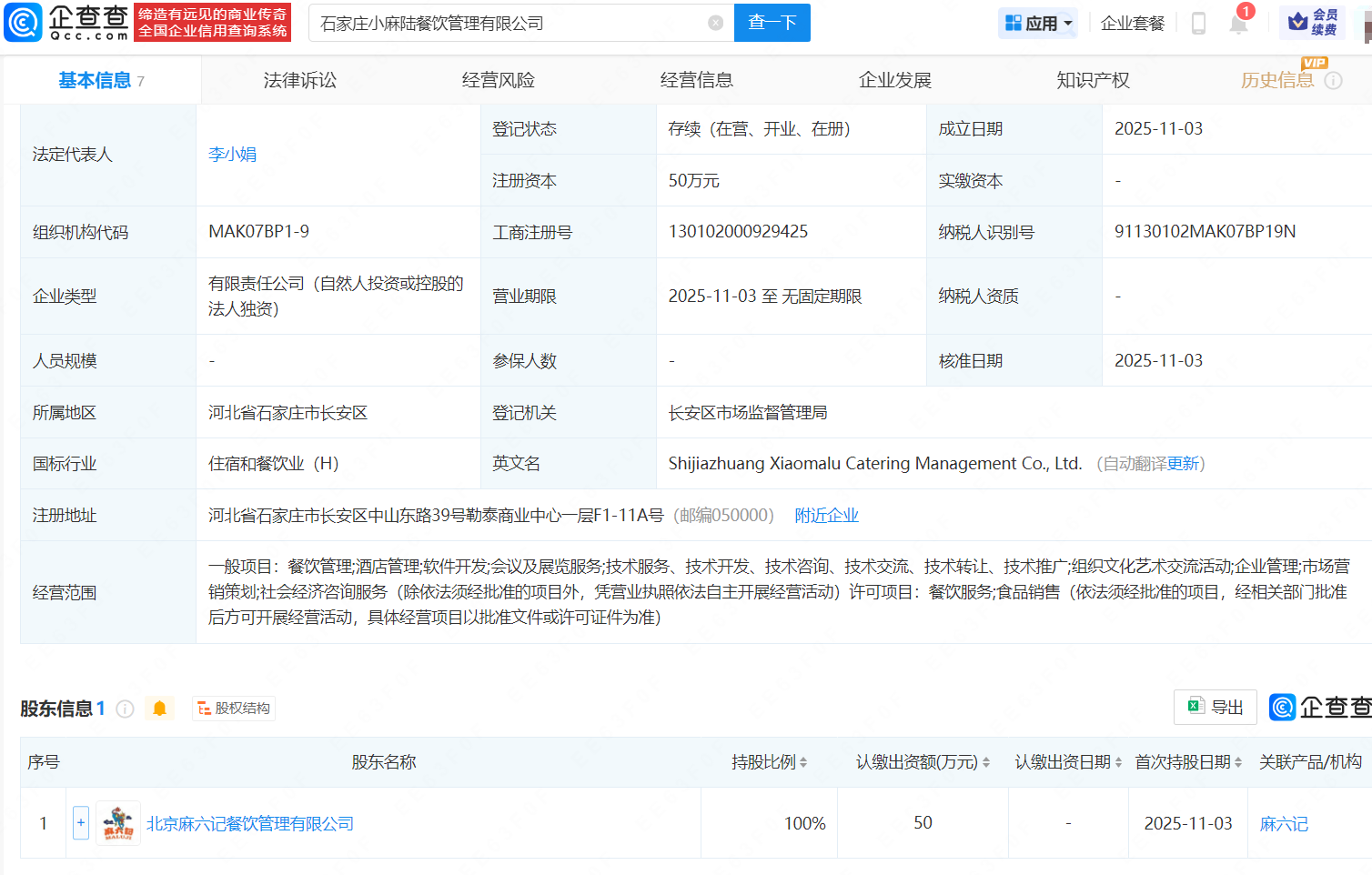 近日,石家庄小麻陆餐饮管理有限公司成立明福今投,法定代表人为李小娟,注册资本50万,经营范围包含餐饮管理、酒店管理、食品销售等。企查查股权穿透显示,该公司由北京麻六记餐饮管理有限公司全资持股。