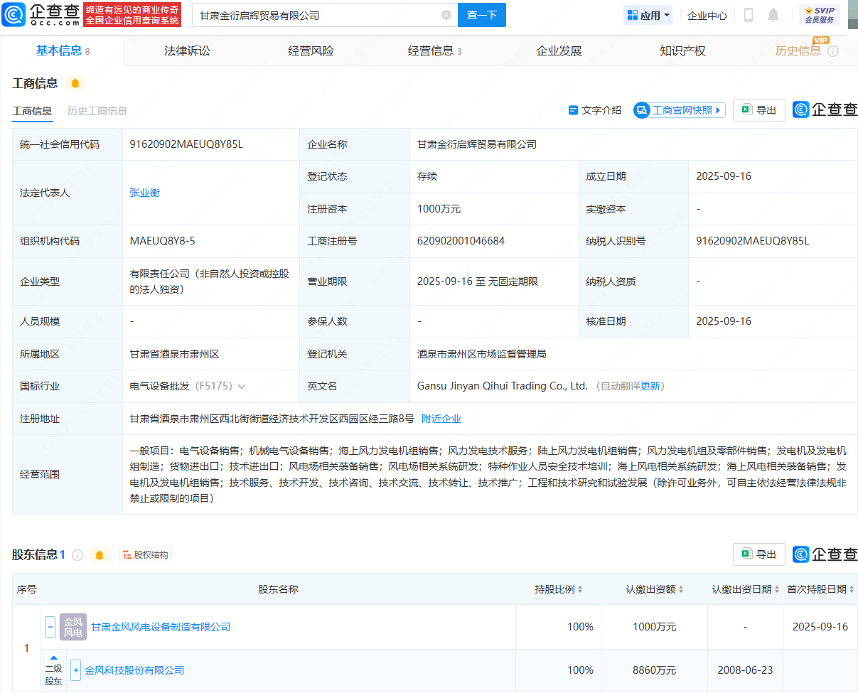 近日,甘肃金衍启辉贸易有限公司成立,法定代表人为张业衡,注册资本为1000万元,经营范围包含:海上风力发电机组销售;风力发电技术服务;陆上风力发电机组销售;风力发电机组及零部件销售等。企查查股权穿透显示牛8速配,该公司由金风科技(002202)间接全资持股。